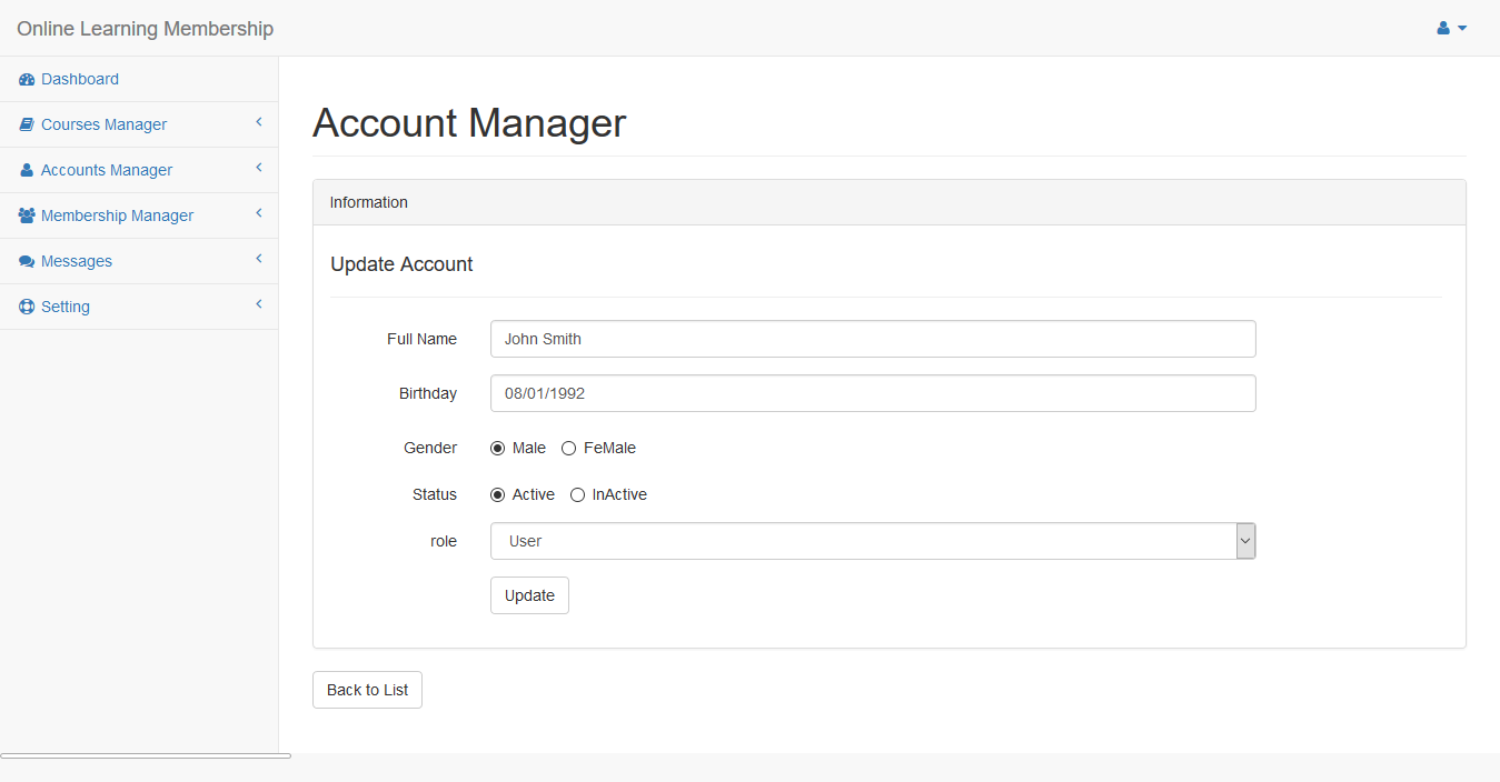 Click Update button from account list to update account.