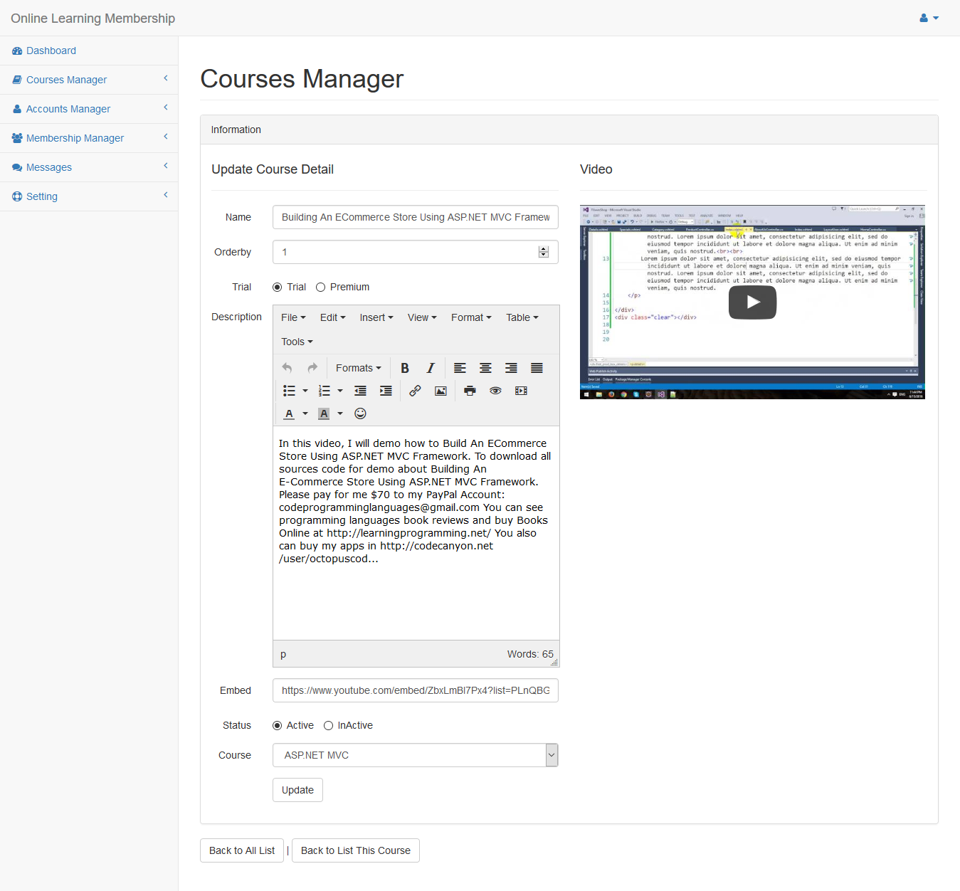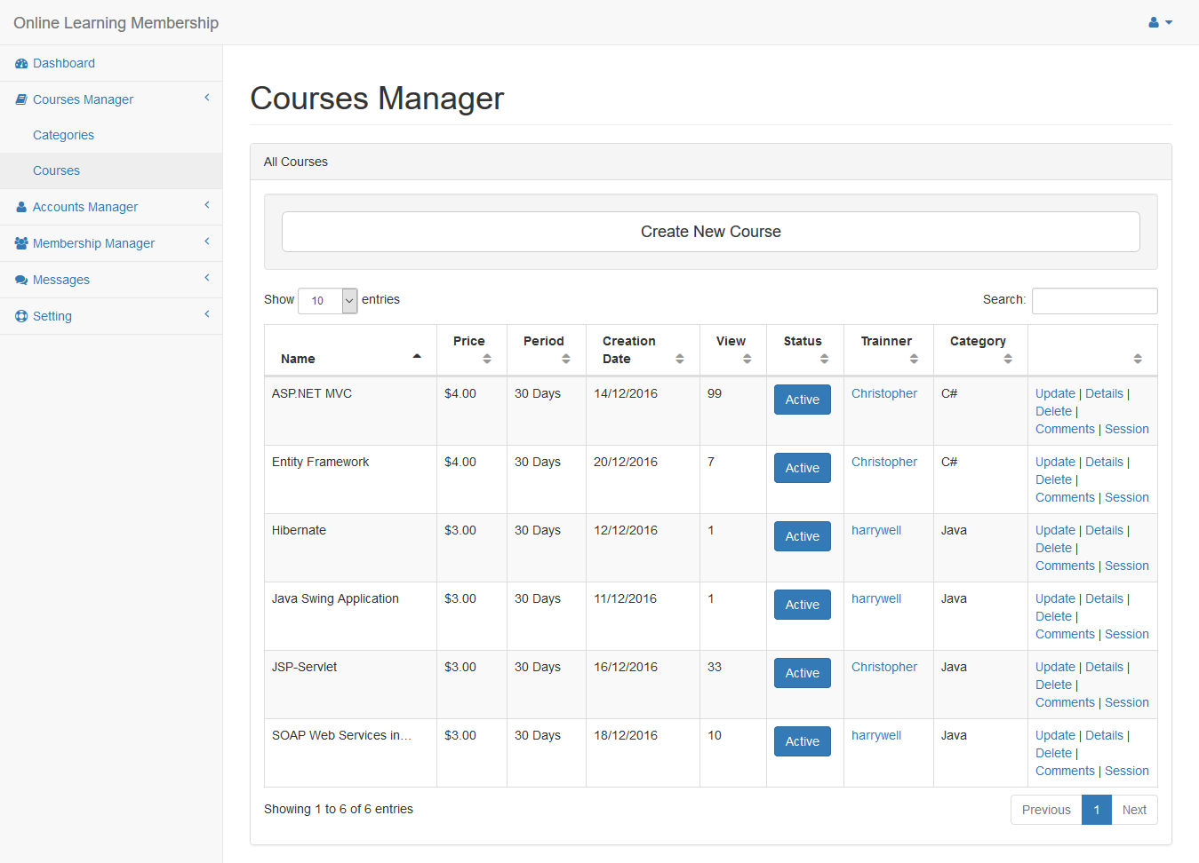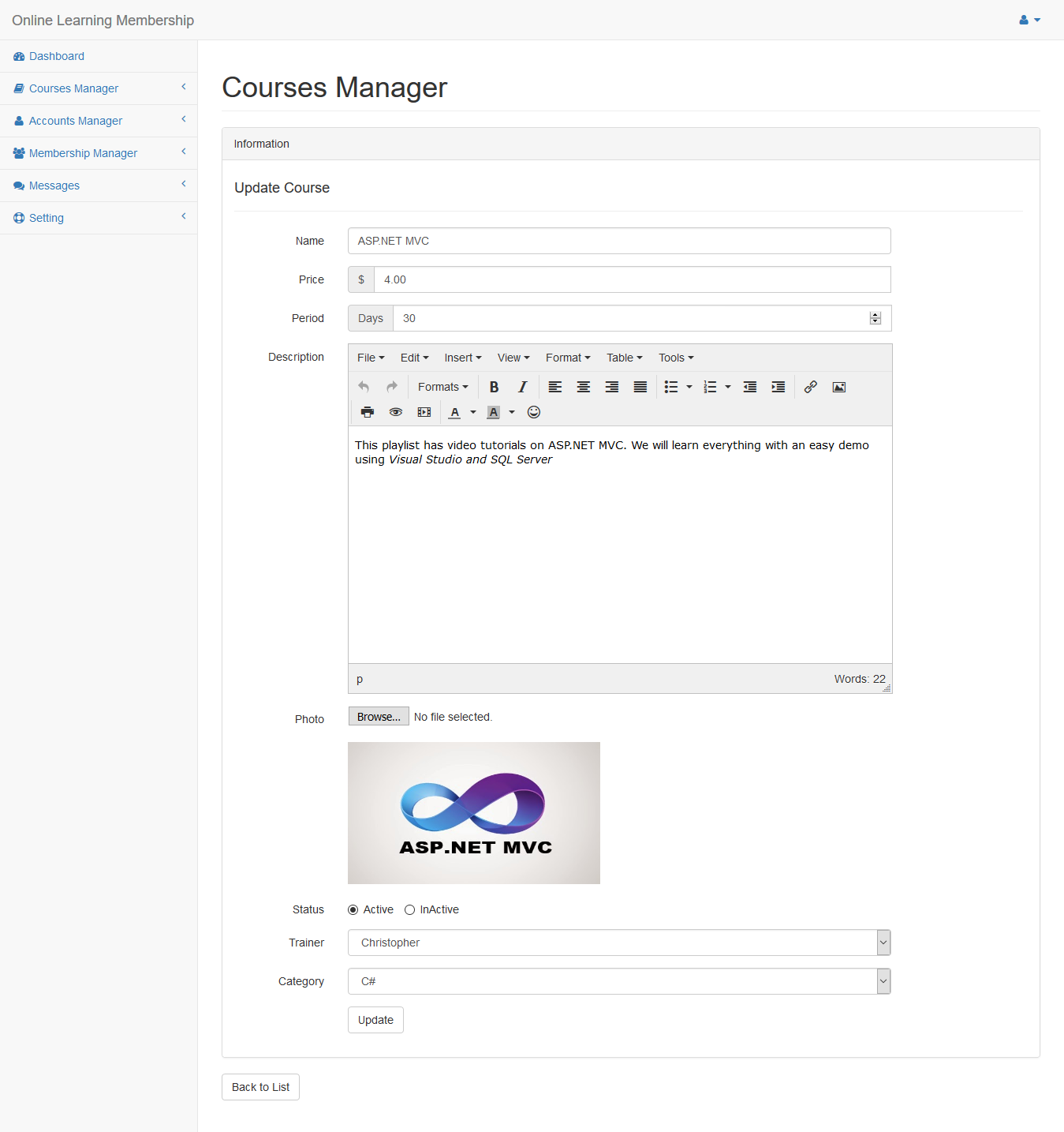 Click Edit link to update course from courses list