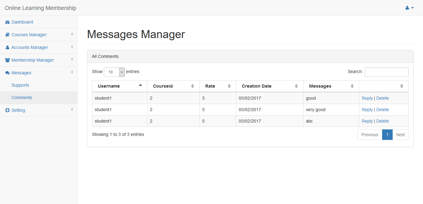 Click Comments link to see comments list of couse