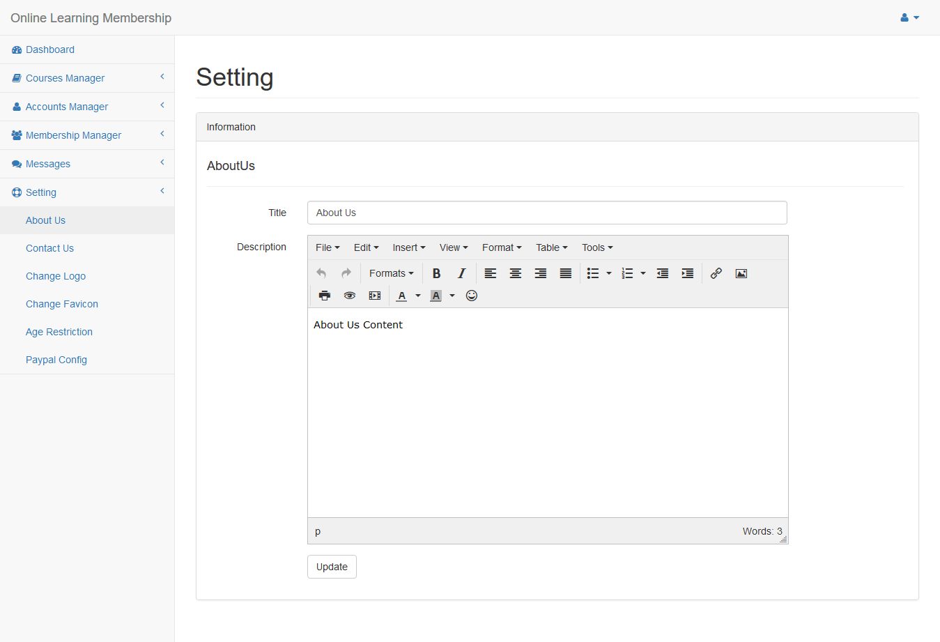 Click Setting/About Us menu in the left side to change content of about us page