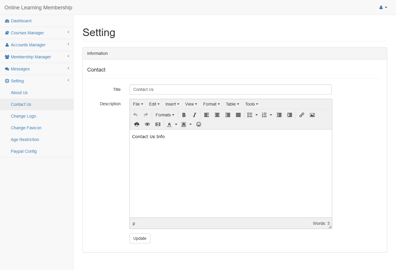 Click Setting/Contact Us menu in the left side to change content of contact us page